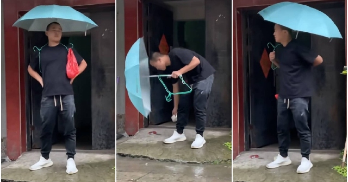 Πιο συγκεκριμένα, στο βίντεό του που ξεπέρασε τις 6.7 εκατομμύρια προβολές τον βλέπουμε να δημιουργεί μια ομπρέλα-γιλέκο, την οποία μπορεί να τη φοράει και να βγαίνει άνετα βόλτα στη βροχή.