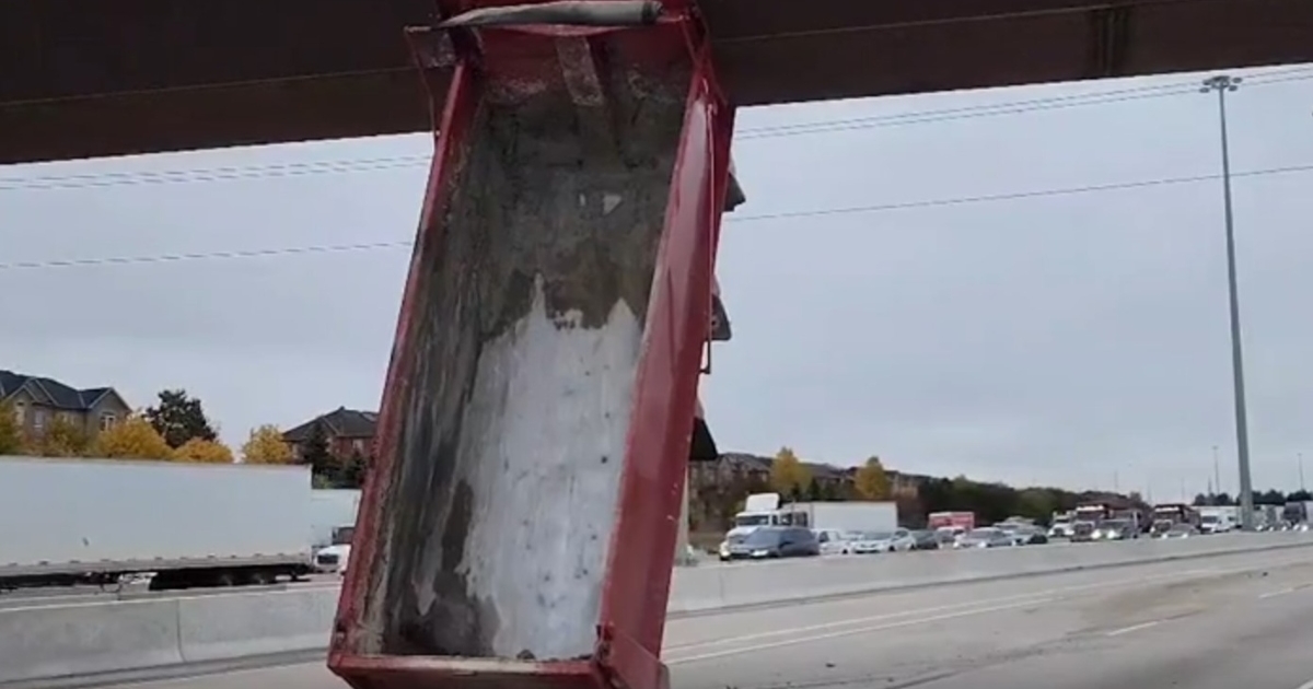 Ο οδηγός είχε μόλις ξεφορτώσει το φορτίο που μετέφερε, ωστόσο ξέχασε να κατεβάσει την καρότσα, με αποτέλεσμα να μπλοκαριστεί μεταξύ του αυτοκινητόδρομου 401 και μιας διάβασης πεζών.