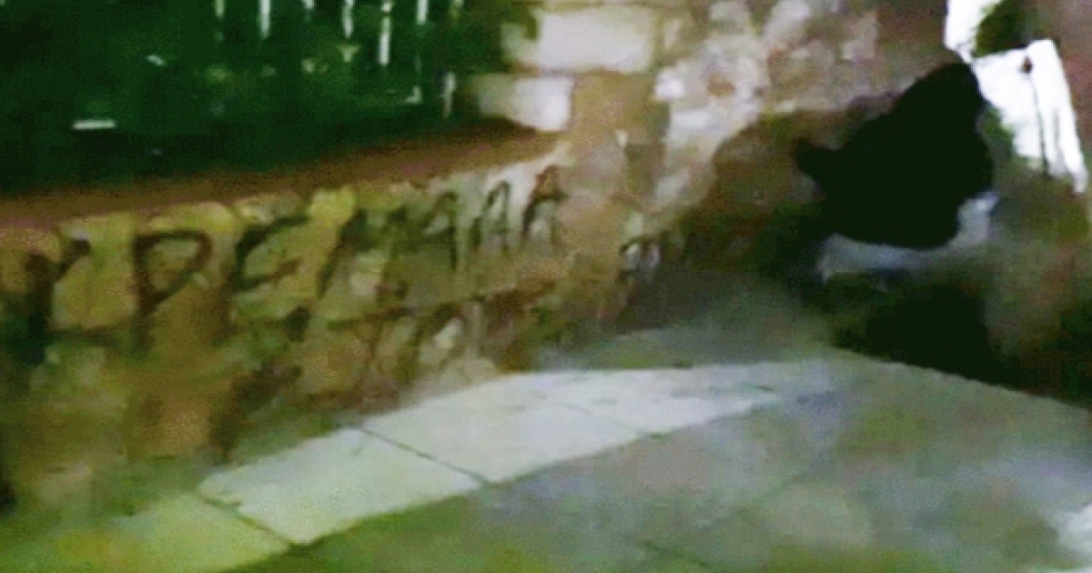 Μέλη της οργάνωσης έγραψαν συνθήματα με μαύρο σπρέι στην περίφραξη της κατοικίας στην Ηλιούπολη.