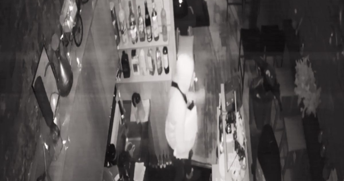 Έχοντας στο χέρι έναν μικρό φακό και φορώντας λευκό φούτερ με κουκούλα, ο δράστης έψαξε επιμελώς τα ντουλάπια του καταστήματος.