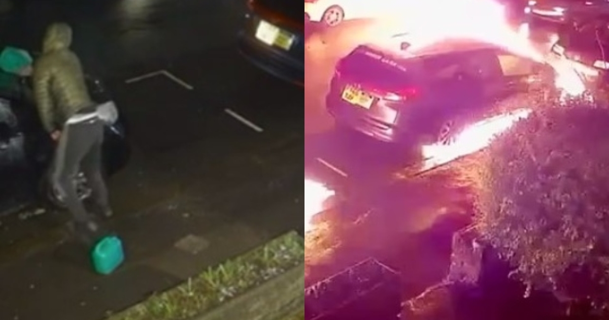 Αστυνομικοί και πυροσβέστες κλήθηκαν στο περιστατικό στις 10 το βράδυ εν μέσω των φόβων ενός κατοίκου ότι το σπίτι του θα καταστρεφόταν μετά την πυρπόληση του αυτοκινήτου του. Τα πλάνα δείχνουν έναν κουκουλοφόρο να πετάει τα καύσιμα από ένα δοχείο πριν ανάψει ένα σπίρτο και απομακρυνθεί τρέχοντας από τα φλεγόμενα αυτοκίνητα.