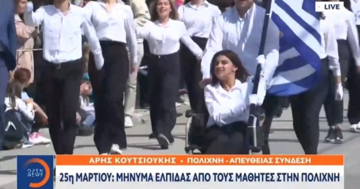 Μια 17χρονη μαθήτρια σημαιοφόρος σε αναπηρικό αμαξίδιο παρέλασε σήμερα (25/3) στην Πολίχνη. Οι καθηγητές της δήλωσαν υπερήφανοι που την έχουν στις τάξεις τους. Συγκίνηση και περηφάνια στην παρέλαση για την 25η Μαρτίου στην Πολίχνη Θεσσαλονίκης.