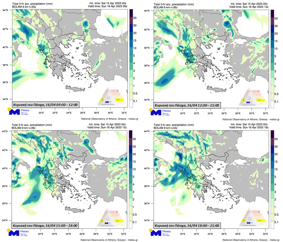 Σύμφωνα με την κατηγοριοποίηση του επεισοδίου βροχόπτωσης (RPI), η οποία εφαρμόζεται από τη μονάδα Μeteo του Εθνικού Αστεροσκοπείου Αθηνών, το αναμενόμενο επεισόδιο βροχόπτωσης κατατάσσεται στην Κατηγορία 2 (Μέτρια). Στους χάρτες που ακολουθούν παρουσιάζεται ο υετός που αναμένεται ανά τρίωρο από το πρωί έως το απόγευμα της Κυριακής του Πάσχα, 16/04.