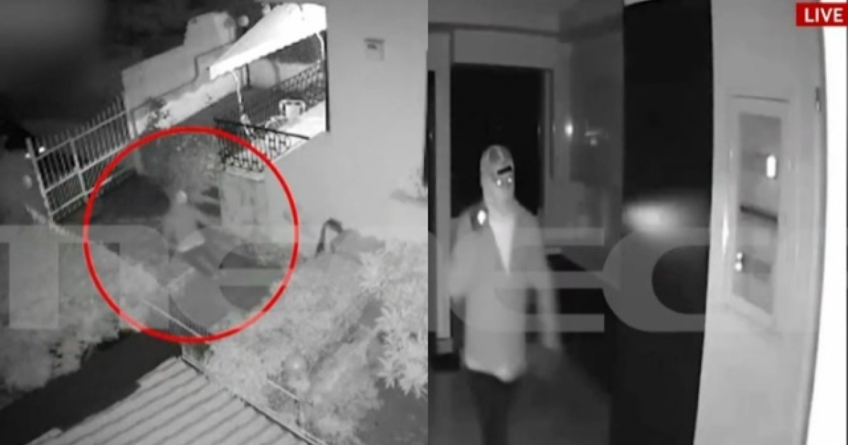 Η ώρα είναι δέκα λεπτά πριν από τα μεσάνυχτα. Στο αποκλειστικό βίντεο ντοκουμέντο που εξασφάλισε το MEGA, ο δράστης περπατάει με χαλαρό βήμα μέσα στην κουζίνα. Κρατάει στα χέρια τους φακό, φοράει καπέλο τζόκεϊ ανάποδα και μάσκα full-face που διακρίνονται μόνο τα μάτια του.