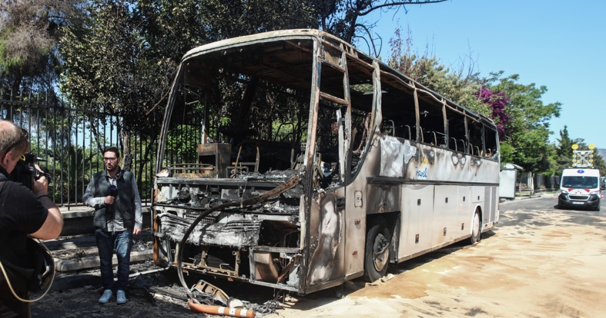 Από τις μολότοφ προκλήθηκε φωτιά, από την οποία κάηκε ολοσχερώς ένα τουριστικό λεωφορείο, σοβαρές ζημιές υπέστη ένα δεύτερο και μικρότερες ένα τρίτο.