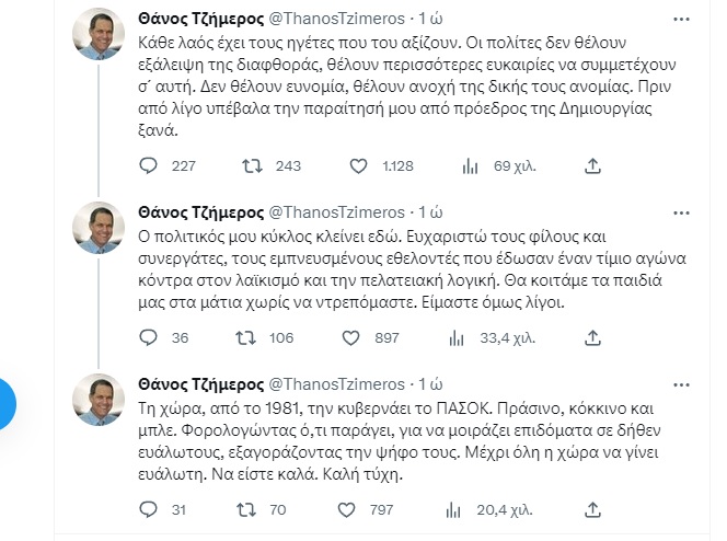 Ο πολιτικός μου κύκλος κλείνει εδώ. Ευχαριστώ τους φίλους και συνεργάτες, τους εμπνευσμένους εθελοντές που έδωσαν έναν τίμιο αγώνα κόντρα στον λαϊκισμό και την πελατειακή λογική. Θα κοιτάμε τα παιδιά μας στα μάτια χωρίς να ντρεπόμαστε. Είμαστε όμως λίγοι.