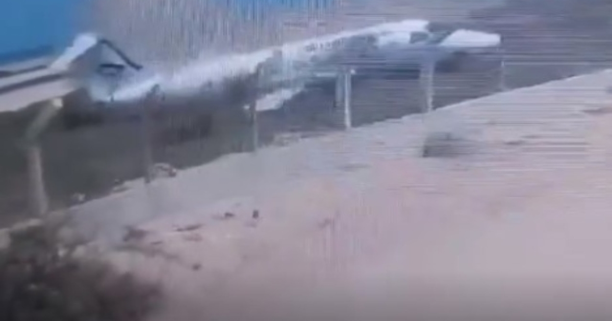 Οι εικόνες που κυκλοφορούν στα μέσα κοινωνικής δικτύωσης αποκαλύπτουν το αεροσκάφος με μερικώς αποκολλημένο πιλοτήριο, που ακουμπά δίπλα σε έναν χαμηλό τσιμεντένιο τοίχο.
