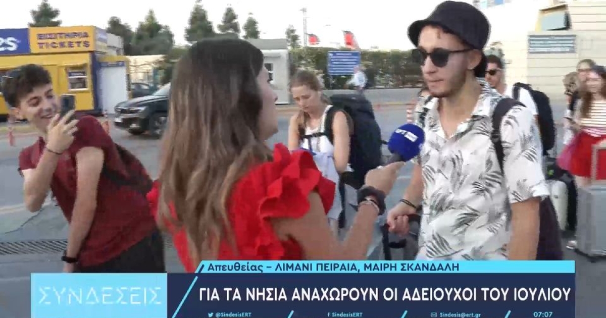 Στο λιμάνι του Πειραιά βρέθηκε η ρεπόρτερ της ΕΡΤ, Μαίρη Σκανδάλη για τις ανάγκες της εκπομπής «Συνδέσεις» και εκεί σταμάτησε μια παρέα νεαρών που ετοιμαζόταν να επιβιβαστεί στο πλοίο.
