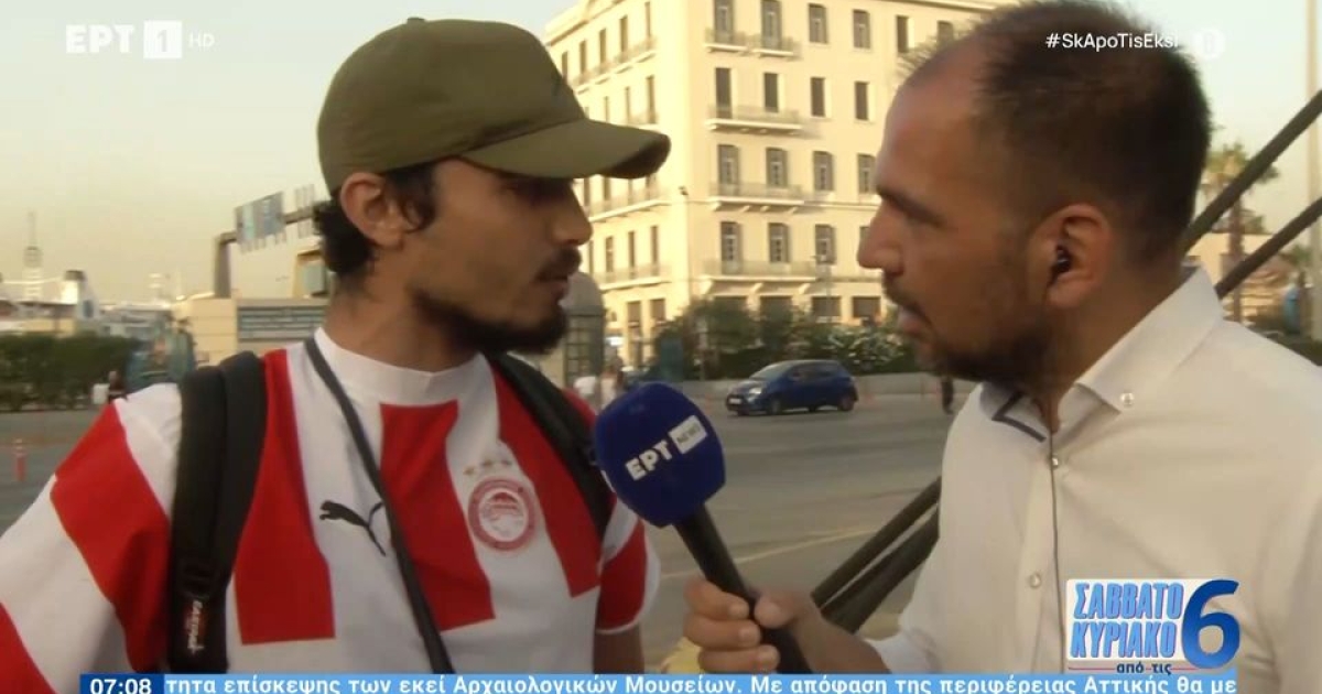 Ο δημοσιογράφος σταμάτησε έναν νεαρό, ο οποίος φορούσε την εμφάνιση του Ολυμπιακού. Όπως διαπιστώθηκε ήταν Γάλλος τουρίστας και οπαδός της Μαρσέιγ. Όπως είπε ήταν η πρώτη του φορά στην Ελλάδα και ετοιμαζόταν να επιβιβαστεί στο πλοίο για Σαντορίνη.