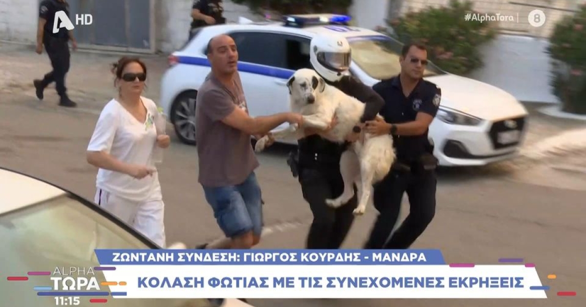 Φωτιά στη Μάνδρα: Η στιγμή που αστυνομικοί μεταφέρουν τρομαγμένο σκυλί (vid)
