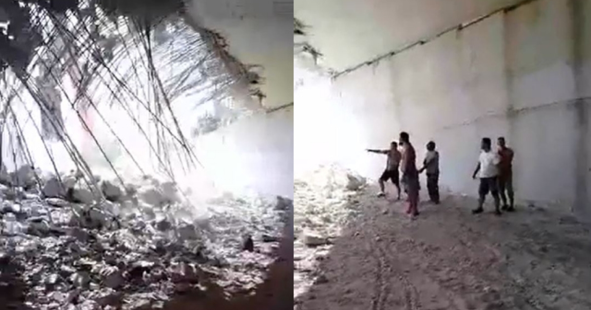 Από το πάνω μέρος πέφτουν μπάζα την ώρα που οι άνθρωποι που βρίσκονται κάτω από τη γέφυρα παρακολουθούν φοβισμένοι, ενώ κάποιος άλλος μαζεύει τα σίδερα που έχουν καταρρεύσει.