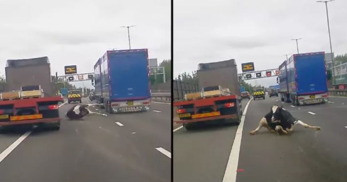 Η στιγμή που αγελάδα πέφτει από φορτηγό και προκαλεί χάος σε αυτοκινητόδρομο (vid)