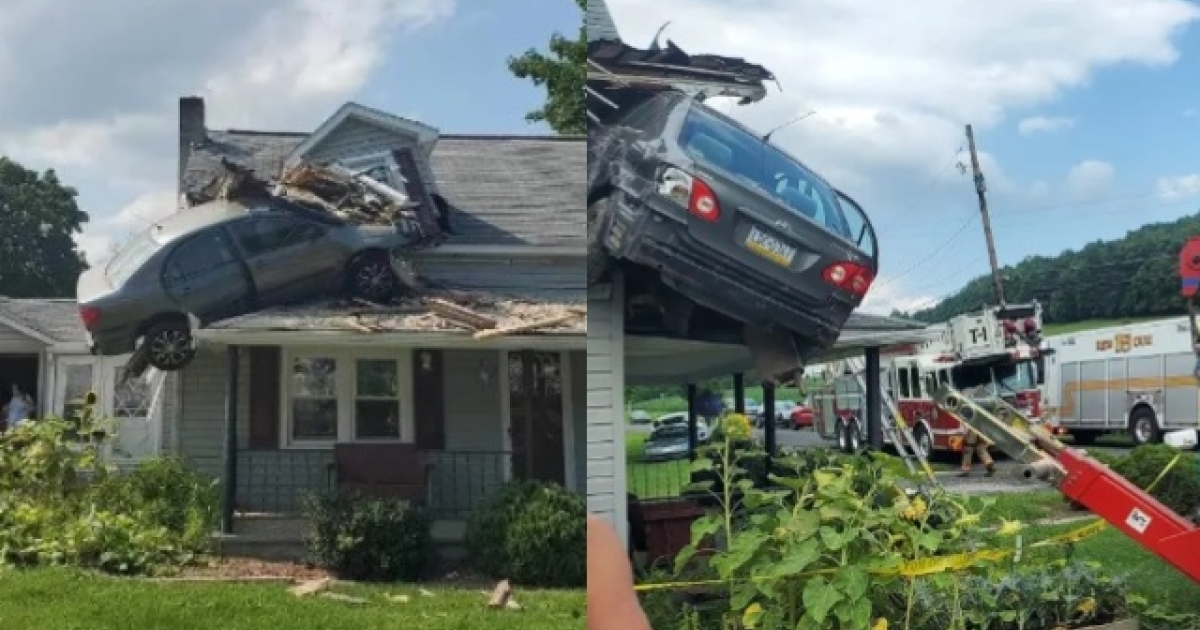 Αυτοκίνητο απογειώθηκε και προσγειώθηκε οροφή σπιτιού: Οι πυροσβέστες δεν ήξεραν πως να απεγκλωβίσουν τον οδηγό (vid)