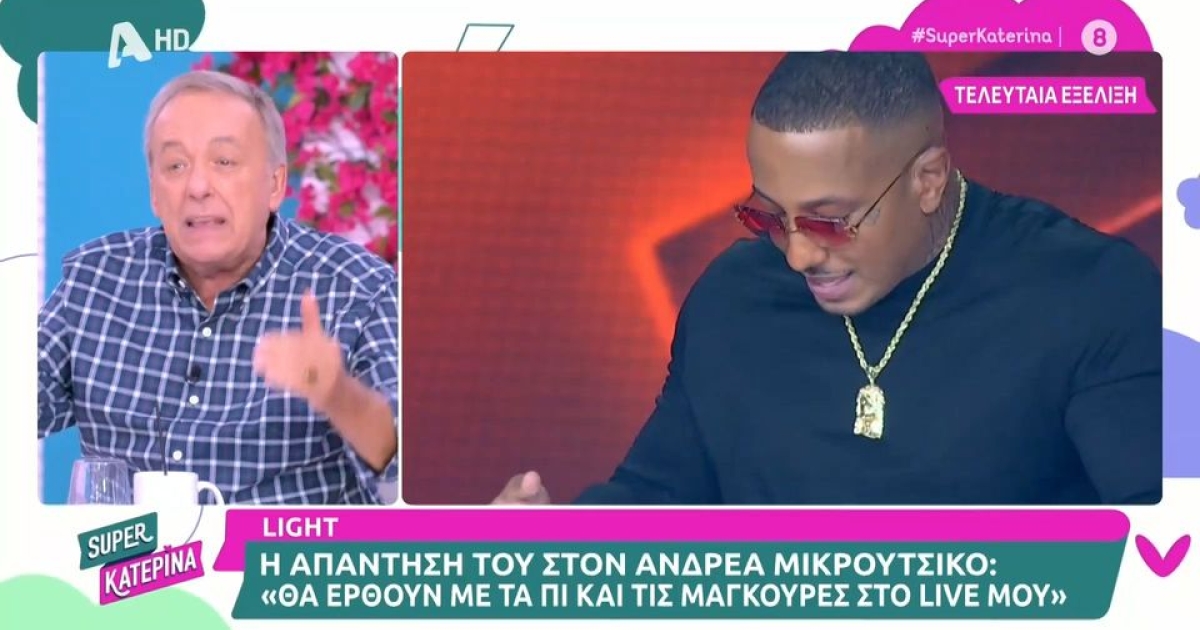Ο Ανδρέας Μικρούτσικος σχολίασε τη στάση του Light μέσα από την εκπομπή «Super Κατερίνα» στην οποία συμμετέχει και λίγο αργότερα ήρθε η απάντηση από τον τράπερ, ο οποίος τον προέτρεψε να πάρει τους φίλους που έχει μαζέψει και να πάνε σε συναυλία του, με πι και μαγκούρες.