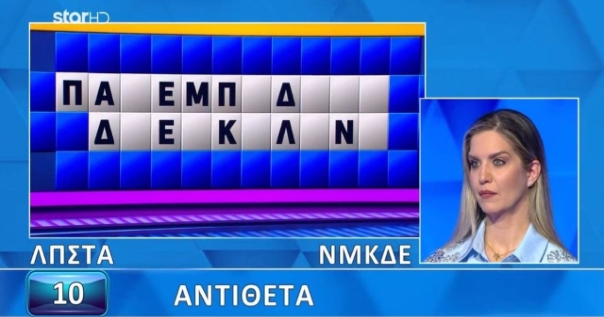 Τα γράμματα που δόθηκαν ήταν το «Λ», το «Π», το «Σ», το «Τ» και το «Α». Οι επιλογές της παίκτριας ήταν «Ν», «Μ», «Κ», «Δ» και «Ε».