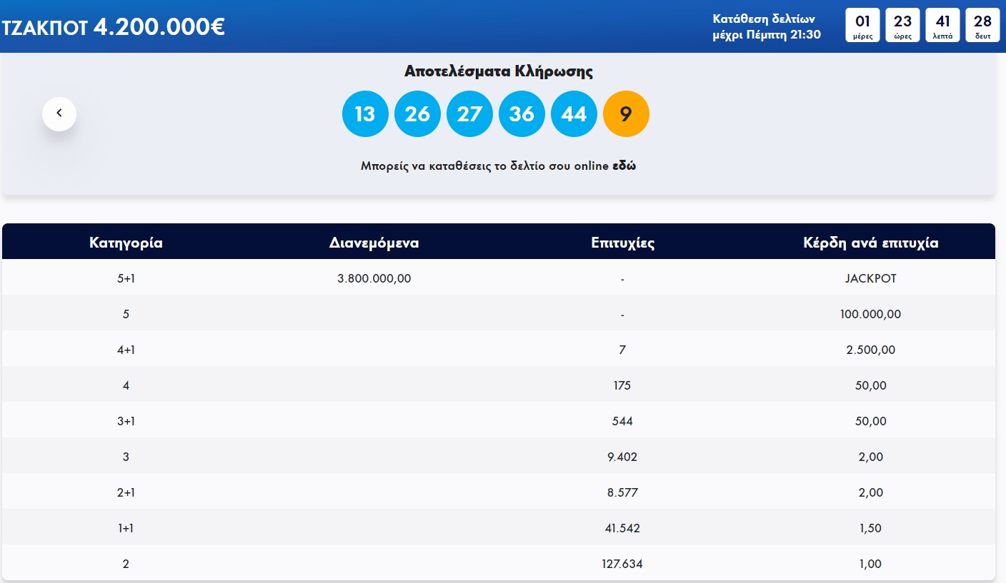 Δεν βρέθηκε τυχερός στην πρώτη κατηγορία με νέο τζακ ποτ που θα μοιράσει 4.200.000 ευρώ.
