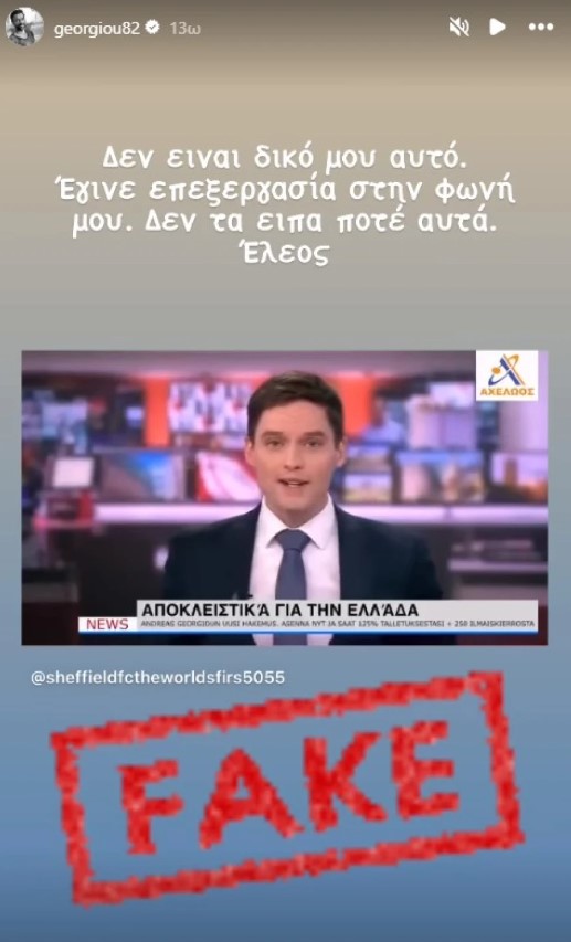 Ο δημιουργός των σειρών του MEGA, «Γη της Ελιάς» και «Famagusta», μέσω ενός instastory, γνωστοποίησε την απάτη γράφοντας: «Δεν είναι δικό μου αυτό. Έγινε επεξεργασία στη φωνή μου. Δεν τα είπα ποτέ αυτά. Έλεος».