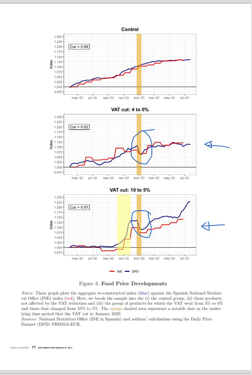 *Σύμφωνα με πρόσφατη έκθεση της ισπανικής Κεντρικής Τράπεζας, στη σελ. 17 διαπιστώνεται σε γράφημα ότι οι μειώσεις του ΦΠΑ από την ισπανική κυβέρνηση έχουν μόνο ένα προσωρινό αποτέλεσμα της τάξης των 1-2 μηνών (με σχήμα U κυκλωμένο στα γραφήματα) ενώ στη συνέχεια οι τιμές του πληθωρισμού ανακάμπτουν στα ίδια και υψηλότερα επίπεδα και τη μείωση καρπώνονται οι μεσάζοντες. (Γράφημα 2).