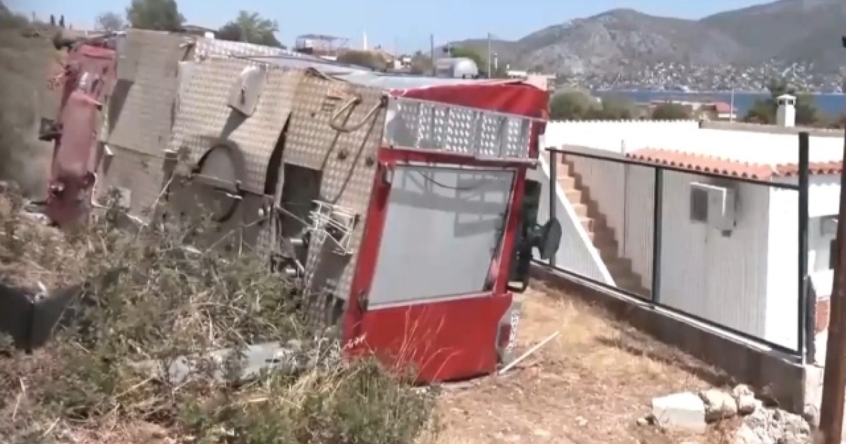 Φωτιά στη Σαλαμίνα: Η στιγμή που ανατρέπεται όχημα της Πυροσβεστικής (vid)