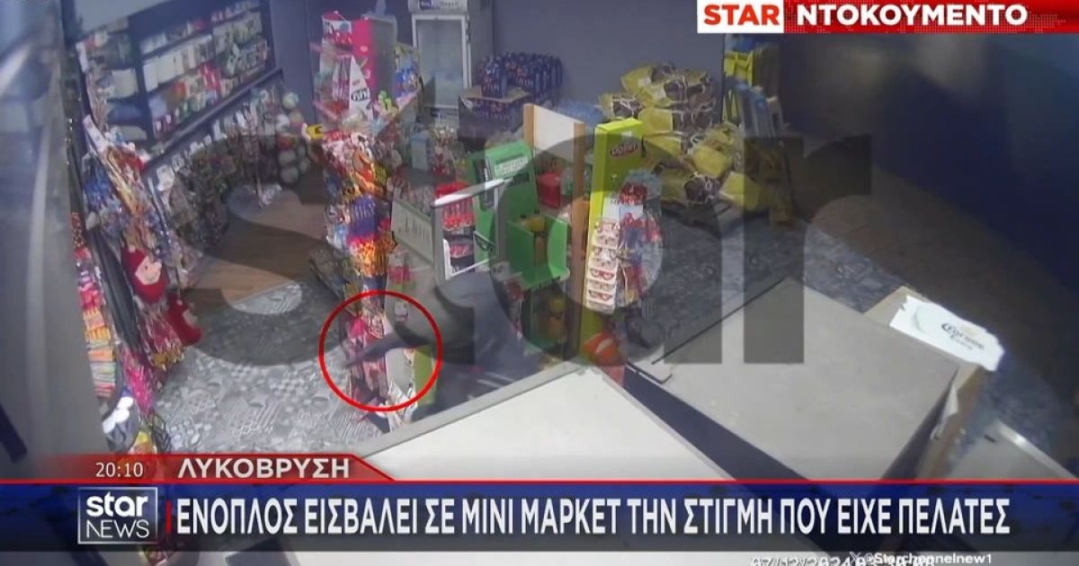Βίντεο ντοκουμέντο που πήρε το φως της δημοσιότητας και δημοσίευσε το STAR αποτυπώνει την στιγμή που δύο ένοπλοι ληστές «μπουκάρουν» σε μίνι μάρκετ στην περιοχή της Λυκόβρυσης και κλέβουν το ταμείο.