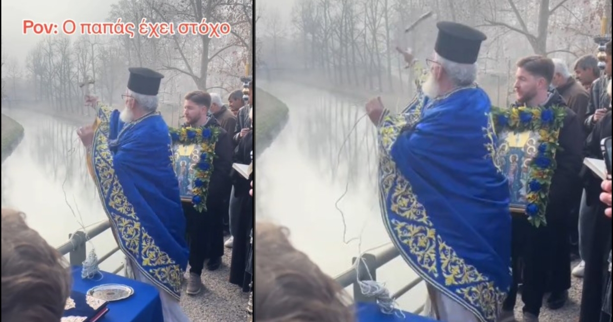 Ένα μικρό ατύχημα συνέβη σήμερα (06/01) στην τελετή των Θεοφανίων σε ενορία των Τρικάλων. Συγκεκριμένα, σε ένα βίντεο που έχει ανέβει στο TikTok και έχει γίνει viral φαίνεται ένας ιερέας να... χάνει τον στόχο του και να εκτοξεύει το σταυρό κατευθείαν στο κεφάλι ενός πιστού.