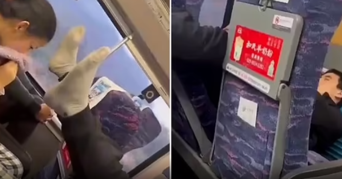 Τα εν λόγω πλάνα από το βίντεο που έχει γίνει viral στα μέσα κοινωνικής δικτύωσης δείχνουν τον Κινέζο ταξιδιώτη να κοιμάται στο κάθισμα του τρένου έχοντας απλώσει τα πόδια του φορώντας κάλτσες σε μια νεαρή η οποία δείχνει να μην μπορεί να αναπνεύσει από την δυσοσμία καλύπτοντας μάλιστα την μύτη της με μια πετσέτα, στο Guangxi, στη νότια Κίνα.