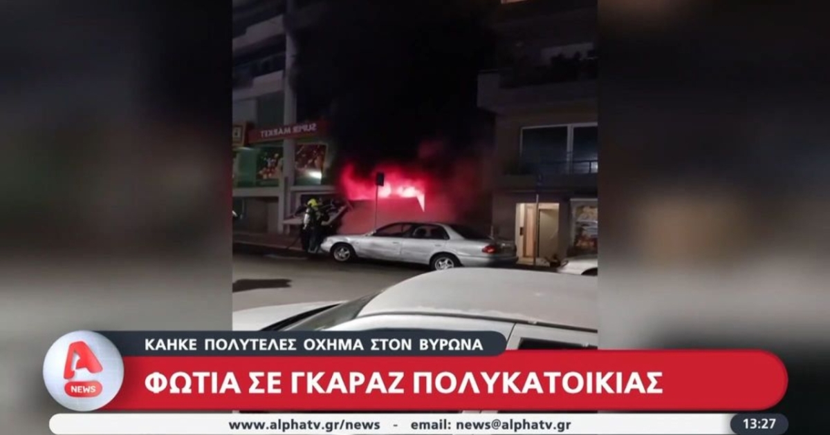 Φωτιά σε γκαράζ πολυκατοικίας στον Βύρωνα, με πολυτελές αυτοκίνητο να γίνεται... στάχτες.