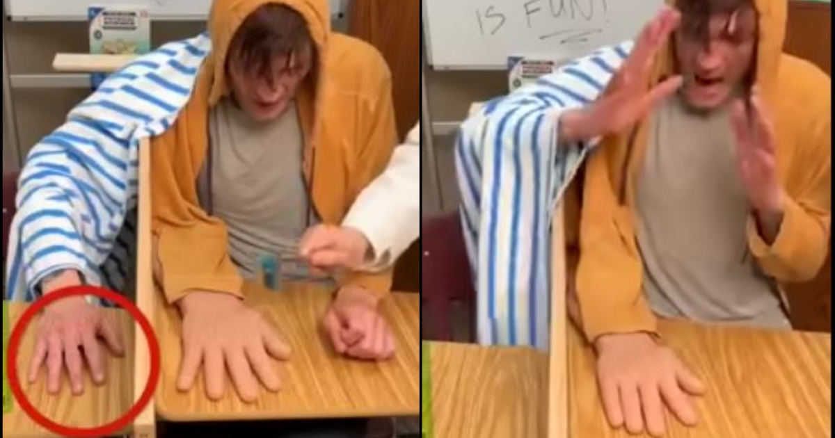 Και αφού τελειώνει με αυτή τη διαδικασία ο καθηγητής βγάζει ένα σφυρί. Του χτυπάει με δύναμη το ψεύτικο χέρι και ο μαθητής τινάζει το αληθινό και ουρλιάζει.