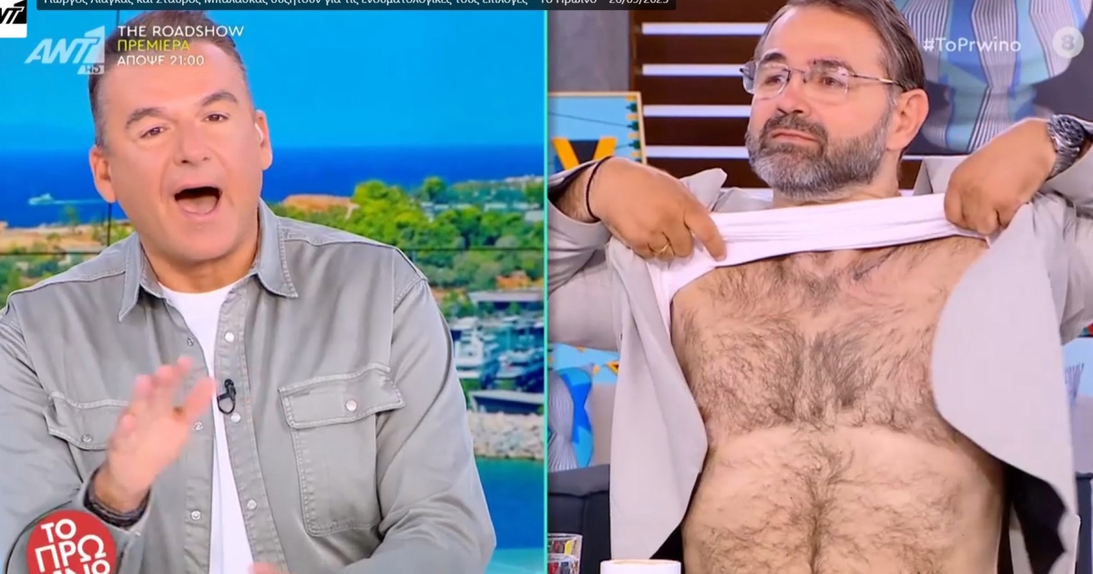 Ένα απρόοπτο περιστατικό προκάλεσε αμηχανία το πρωί της Παρασκευής (26/09) στην εκπομπή «Το Πρωινό» του ΑΝΤ1, όταν ο Σταύρος Μπαλάσκας, γνωστός από τις τηλεοπτικές του εμφανίσεις ως πρώην αξιωματικός της ΕΛ.ΑΣ., σήκωσε ξαφνικά την μπλούζα του μπροστά στην κάμερα, αφήνοντας άφωνους παρουσιαστές και κοινό.