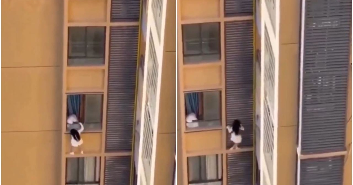 A dramatic video from Guangdong, China, shows a woman clinging to the outside of a 10th-floor building while trying to escape after her lover’s wife unexpectedly returned home. The mistress was seen sliding down drainpipes and knocking on a neighbour’s window before being pulled… pic.twitter.com/D1Pe5WxqA4