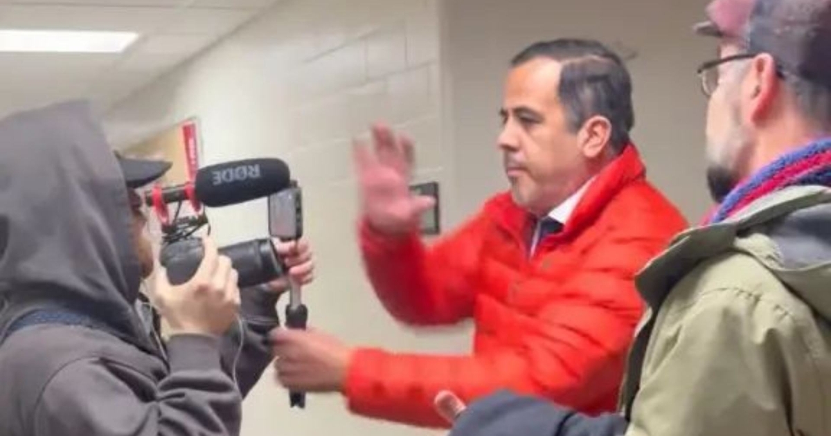 Το βίντεο που δημοσιεύθηκε την Τρίτη από έναν τοπικό συντάκτη ενός ενημερωτικού δελτίου, δείχνει τον επίκουρο καθηγητή Λουκ Πέρεζ να βρίσκεται σε έναν διάδρομο μέσα στο campus, όταν ο δημοσιογράφος και κάμεραμαν Μάικ Νιούμαν τον πλησιάζει κρατώντας μια κάμερα και ένα κινητό.