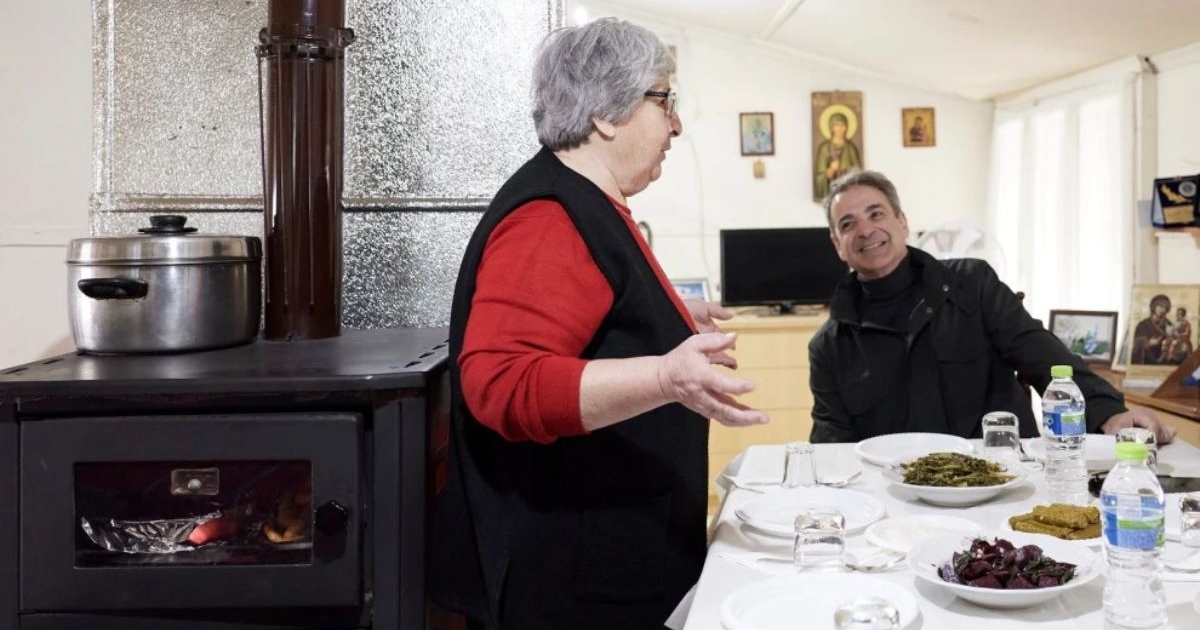 Ο πρωθυπουργός κάθισε στο τραπέζι με το ηλικιωμένο ζευγάρι, την Άρτεμη Παπακωστίδου – Διακάκη και τον σύζυγό της Νικόλα, σε ένα σκηνικό απλό, σχεδόν λιτό, αλλά γεμάτο συμβολισμό.