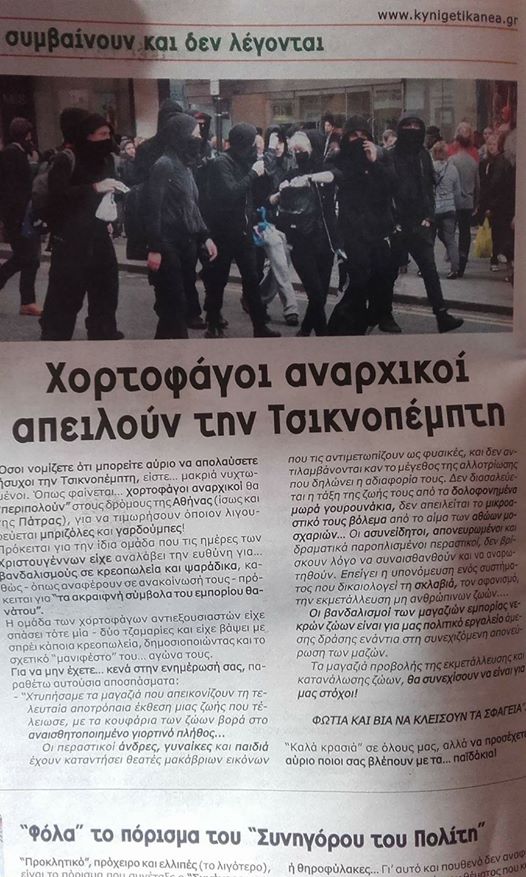 Σας την έχουν στημένη εκεί που θα είστε με το πιρούνι στο χέρι αυτή την Τσικνοπέμπτη αγαπητές φίλες και φίλοι, ενώ πρόκειται για την ίδια ομάδα που είχε κάνει επιθέσεις με σπρέι σε ψαράδικα και χασάπικα τα Χριστούγεννα, οπότε μιλάμε για μια δύναμη κρούσης με βαρύ ιστορικό. Παραθέτουμε αποσπάσματα από την προκήρυξη – ανάληψη ευθύνης που είχαν δημοσιοποιήσει τότε στο Indymedia: