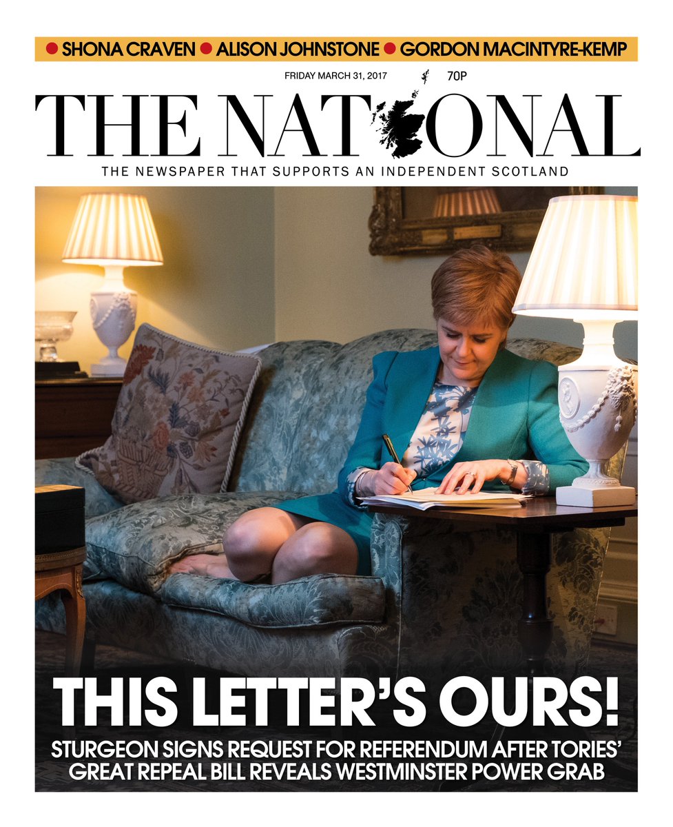 Στην ιστοσελίδα της στο Twitter, η κυβέρνηση της Σκωτίας έχει αναρτήσει μια φωτογραφία της Στέρτζον να κάθεται χαλαρή στον καναπέ με το μήνυμα: "Η πρωθυπουργός Νίκολα Στέρτζον στο Bute House (σ.σ.: την πρωθυπουργική κατοικία) στο Εδιμβούργο επεξεργάζεται το τελικό σχέδιο της επιστολής του Άρθρου 30 προς την πρωθυπουργό Τερέζα Μέι".