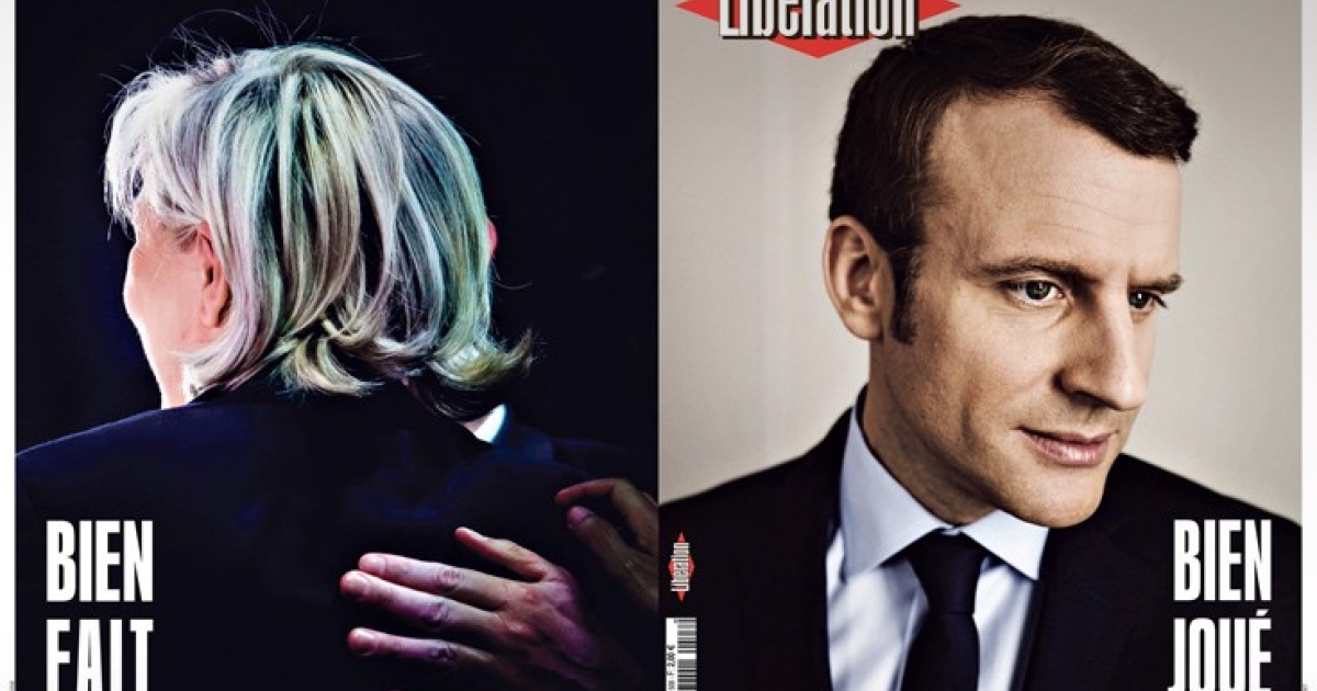 Η Liberation «παίζει» με τους δύο υποψήφιους με διπλό πρωτοσέλιδο- οπισθόφυλλο, με τον Μακρόν στην πρώτη της σελίδα σαν να έρχεται και τη Λεπέν, γυρισμένη πλάτη, στην τελευταία, σαν να φεύγει.