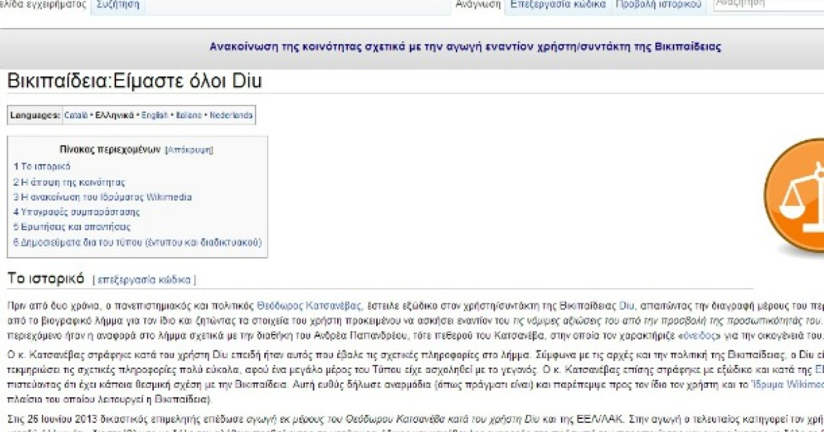 Πριν λίγες ημέρες δικαστικός κλητήρας παρέδωσε στον Diu,αίτηση προσωρινής διαταγής εκδίκασης ασφαλιστικών μέτρων. Συγκεκριμένα ζήτησε «να εκδοθεί προσωρινή διαταγή που να υποχρεώνει τους καθ’ων να απαλείψουν προσωρινά από την περιγραφή του βιογραφικού μου στης Wikipedia τις προσβλητικές της τιμής και της υπολήψεώς μου λέξεις και φράσεις που αναφέρονται στο ιστορικό, μέχρι τη συζήτηση της αιτήσεώς μου και να καταδικασθούν οι εναγόμενοι στην εν γένει δικαστική μου δαπάνη». Την Πέμπτη 13 Φεβρουαρίου 2014, ο χρήστης Diu εμφανίστηκε ενώπιον του προέδρου υπηρεσίας στα δικαστήρια Ευελπίδων για την εκδίκαση της προσωρινής διαταγής.
