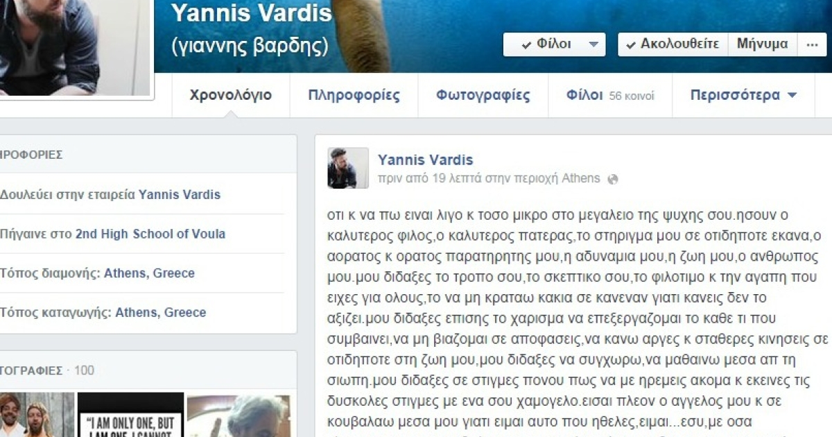 Ο Γιάννης Βαρδής έγραψε στο Facebook του για τον πατέρα του, Αντώνη: «Ότι και να πω είναι λίγο και τόσο μικρό στο μεγαλείο της ψυχής σου. Ήσουν ο καλύτερος φίλος, ο καλύτερος πατέρας, το στήριγμά μου σε οτιδήποτε έκανα, ο αόρατος και ορατός παρατηρητής μου, η αδυναμία μου, η ζωή μου και ο άνθρωπός μου. Μου δίδαξες τον τρόπο σου, το σκεπτικό σου, το φιλότιμο και την αγάπη που είχες για όλους και το να μην κρατάω κακία σε κανέναν γιατί κανείς δεν το αξίζει.