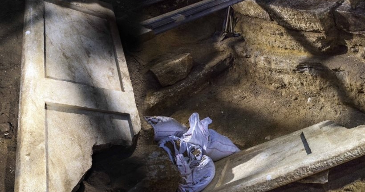 Ως προς τα ευρήματα, σύμφωνα με τις πληροφορίες που φτάνουν στο protothema.gr, δεν υπάρχει κάτι άλλο εκτός από θραύσματα των πώρινων λίθων του λεγόμενου «δαπέδου σφράγισης». Μέχρι στιγμής δεν υπάρχει κανένα ίχνος κινητού ευρήματος, ούτε οργανικού (τέφρα ή οστά), ούτε ανόργανου (σαρκοφάγος, λάρνακα κ.λπ).