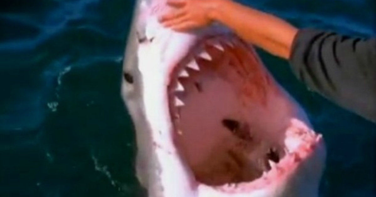 Αντί να φουλάρουν τις μηχανές ένα μέλος του πληρώματος βγάζει το χέρι από την κουπαστή και αρχίζει να παίζει με τον καρχαρία χαϊδεύοντάς τον. Τολμηρός, ριψοκίνδυνος, χωρίς καμία αίσθηση κινδύνου ή απλά ο μεγάλος κυνηγός των θαλασσών ήταν χορτάτος;