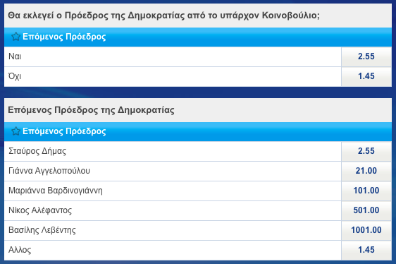 Η Sportingbet το διέπραξε! Έβγαλε το στοίχημα της χρονιάς, με αποδόσεις για τον επόμενο Πρόεδρο της Δημοκρατίας. Πλάι στον Σταύρο Δήμα, στην Γιάννα Αγγελοπούλου -που εσχάτως έκανε την επιστροφή της- και την Μαριάννα Βαρδινογιάννη, έρχονται από το πουθενά να ταράξουν τα λιμνάζοντα ύδατα της πολιτικής, δύο πραγματικοί Τιτάνες. Ο Νίκος Αλέφαντος με απόδοση 501 και από... κοντά και ο Βασίλης Λεβέντης με απόδοση 1001! Μιλάμε για στοίχημα που «απειλεί» την ίδια τη Βουλή και για το τιμήσουμε, σας παρουσιάζουμε δύο από τα επικότερο βίντεο στη νεότερη ελληνική ιστορία.