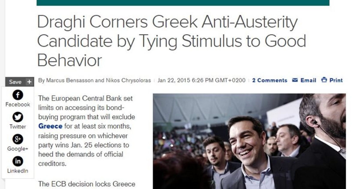 Για απόφαση που θέτει εκτός του προγράμματος ποσοτικής ελάφρυνσης την Ελλάδα μέχρι να λυθούν τα θέματα που έχουν τεθεί σχετικά με την πολιτική που θα ακολουθηθεί μετά τις εκλογές, ζήτημα που αφορά πρωτίστως τον Αλέξη Τσίπρα κάνει λόγο το Bloomberg σχολίαζοντας τις ανακοινώσεις Ντράγκι σχετικά με την Ελλάδα για το πρόγραμμα ποσοτικής χαλάρωσης.