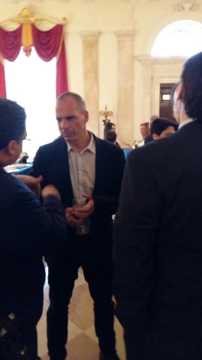 Ο κ. Βαρουφάκης, ο οποίος έσπασε για μια ακόμη φορά το πρωτόκολλο εμφανιζόμενος μπροστά στον Αμερικανό πρόεδρο χωρίς γραβάτα, συνομίλησε για 10 λεπτά, περίπου με τον κ.Ομπάμα. Ηταν η πρώτη φορά που ο πρόεδρος των ΗΠΑ, συνομίλησε με Έλληνα υπουργό για τόσο χρονικό διάστημα σε τέτοιου είδους εκδήλωση.