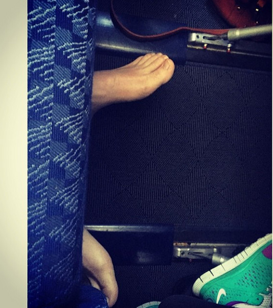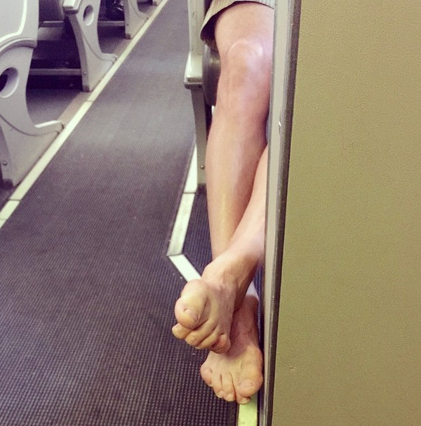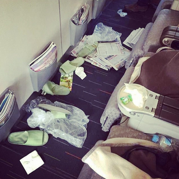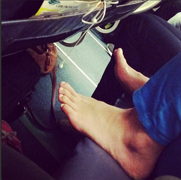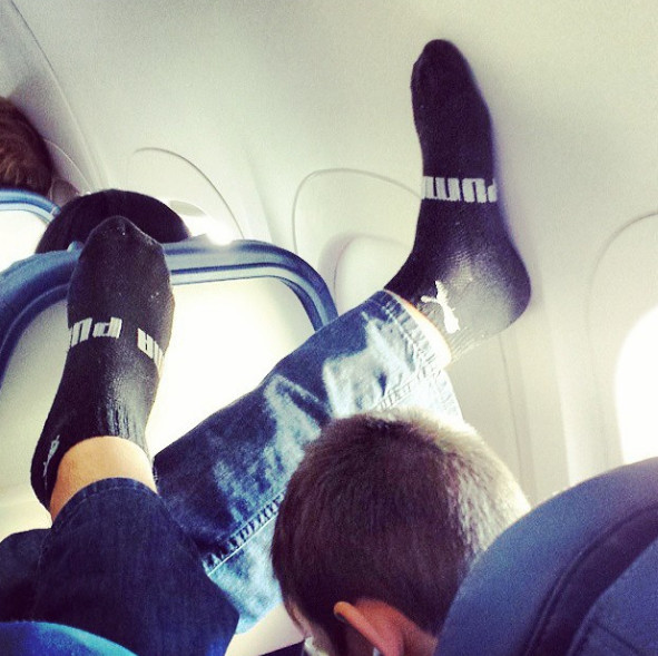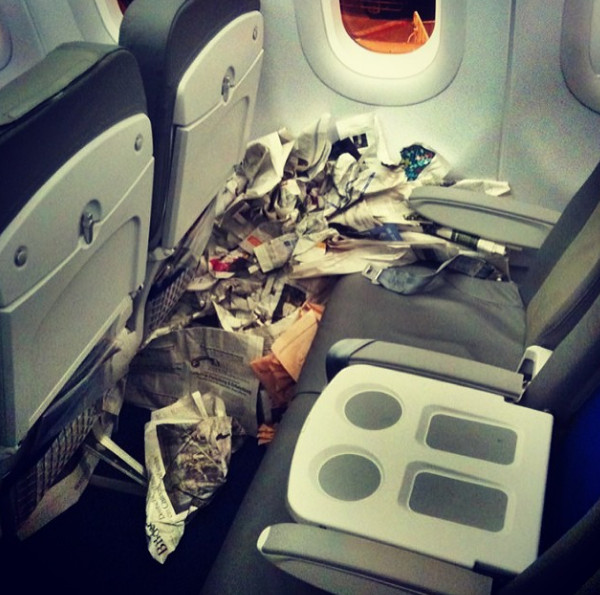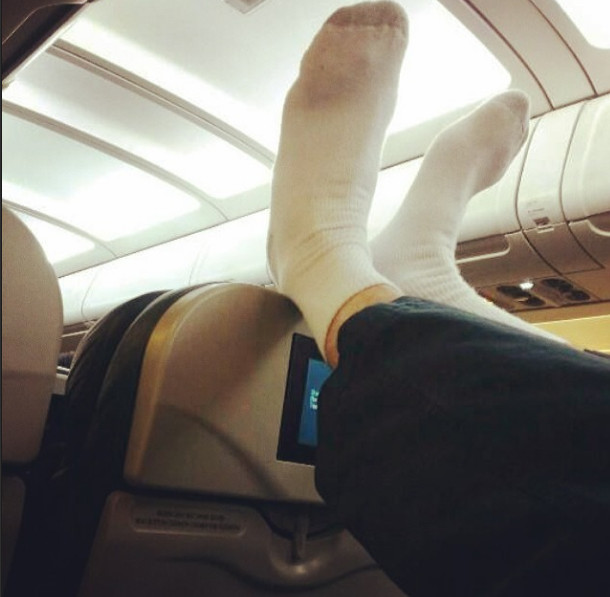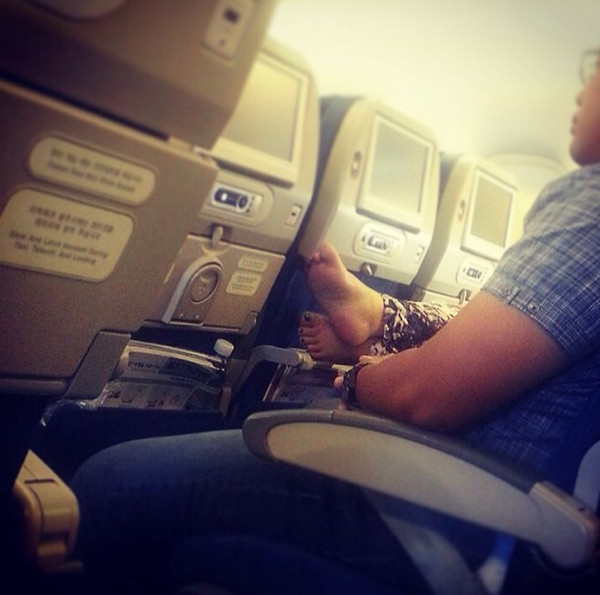 Γυμνά πόδια χωμένα ανάμεσα στα μπροστινά καθίσματα ή κοντά στα κεφάλια άλλων επιβατών, σκουπίδια στις τσέπες των καθισμάτων, λυμένες ζώνες, ξεκουμπωμένα πουκάμισα, ακόμη και επιβάτες να κάνουν γυμναστική ή να παίζουν με... μάσκες.