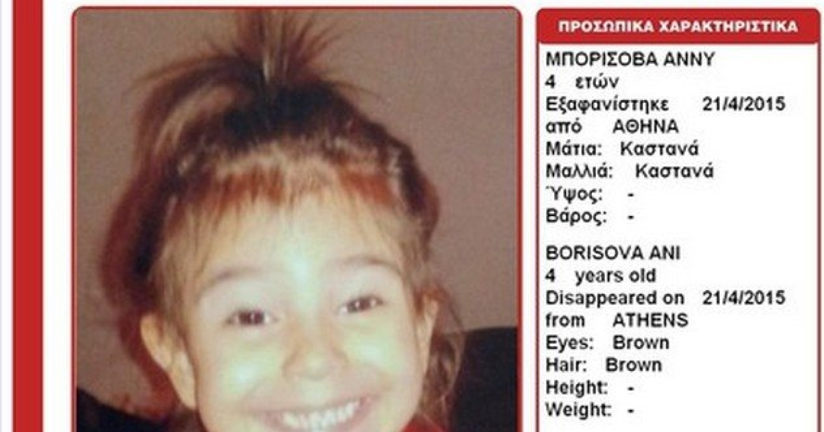 Εξαφανίστηκε από το κέντρο της Αθήνας, η Άννυ Μπορίσοβα, 4 ετών. Η Άννυ έχει καστανά μαλλιά και καστανά ματιά. Ιδιαίτεροι λόγοι καθιστούν αναγκαία την άμεση εύρεσή της, καθώς η ζωή της διατρέχει κίνδυνο.