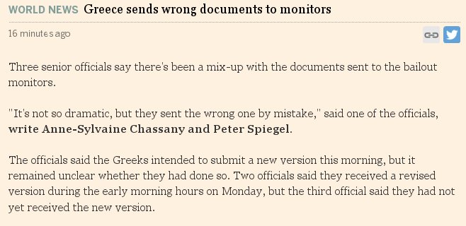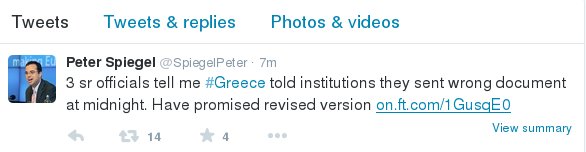 Οπως μεταδίδουν ο Πίτερ Σπίγκελ και η Αν-Σιλβέν Τσασανί, αξιωματούχοι των Θεσμών επιβεβαίωσαν ότι η ελληνική πλευρά έστειλε κατά λάθος άλλα έγγραφα από αυτά που έπρεπε, όμως κατάλαβε αμέσως το λάθος της και τα ξημερώματα αναμενόταν η τελική πρόταση. Ωστόσο, δεν έγινε γνωστό αν τελικά αυτή έφτασε στα χέρια των εταίρων.