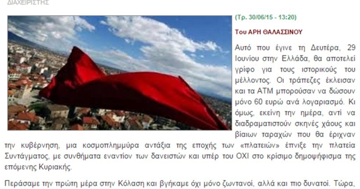 «Αυτό που έγινε τη Δευτέρα, 29 Ιουνίου στην Ελλάδα, θα αποτελεί γρίφο για τους ιστορικούς του μέλλοντος. Οι τράπεζες έκλεισαν και τα ΑΤΜ μπορούσαν να δώσουν μόνο 60 ευρώ ανά λογαριασμό. Κι όμως, εκείνη την ημέρα, αντί να διαδραματιστούν σκηνές χάους και βίαιων ταραχών που θα έριχναν την κυβέρνηση, μια κοσμοπλημμύρα αντάξια της εποχής των «πλατειών» έπνιξε την πλατεία Συντάγματος, με συνθήματα εναντίον των δανειστών και υπέρ του ΟΧΙ στο κρίσιμο δημοψήφισμα της επόμενης Κυριακής.