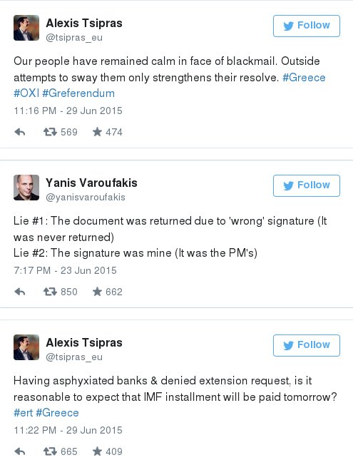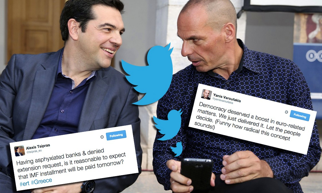 Δεν υπάρχει καλύτερο μέρος για να παρακολουθήσει κανείς την ατελείωτη, χαώδη, κολοσσιαία μάχη του ΣΥΡΙΖΑ με τους δανειστές, από τις αναρτήσεις των βασικών παικτών της Ελλάδας. Οι Τσίπρας και Βαρουφάκης χρησιμοποιούν τα μέσα κοινωνικής δικτύωσης με αρκετούς τρόπους, αλλά το πιο διασκεδαστικό είναι η απίστευτη μαεστρία τους στο «κουτσομπολιό» του Twitter, συνεχίζει το βρετανικό δημοσίευμα. «Είτε είναι για να ρίξουν σκιά στην τρόικα ή για να κριτικάρουν συγκεκριμένους πολιτικούς της ευρωζώνης, οι 140 χαρακτήρες τους είναι 100% τέλειοι».