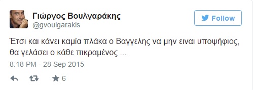 «Έτσι και κάνει καμία πλάκα ο Βαγγέλης να μην είναι υποψήφιος, θα γελάσει ο κάθε πικραμένος ...» έγραψε στον προσωπικό του λογαριασμό στο twitter ο Γιώργος Βουλγαράκης κάνοντας εμμέσως πλην σαφώς γνωστή την άποψή του για τους –μέχρι στιγμής- υποψηφίους.