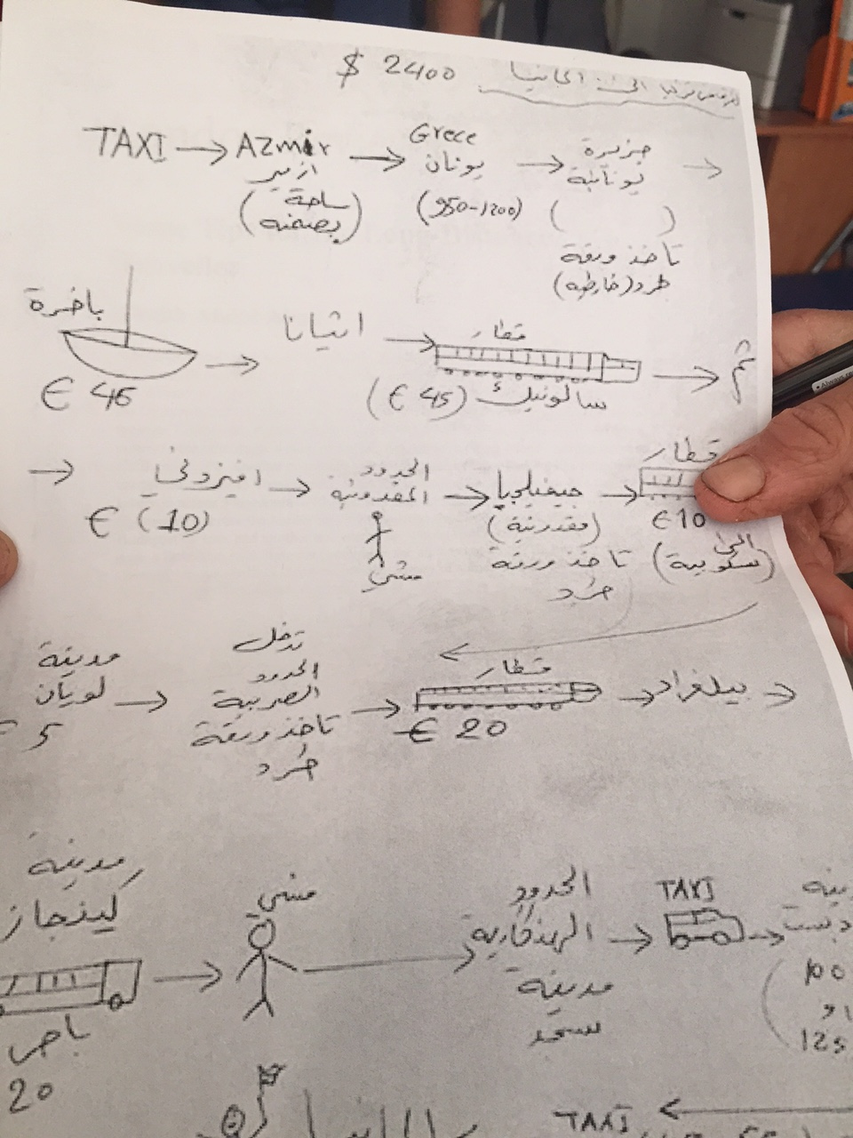 Από το παρακάτω γράφημα, που ήρθε στα χέρια του iefimerida.gr, αποκαλύπτεται όλη η διαδρομή που ακολουθούν πρόσφυγες και μετανάστες από το Αζμίρ της Τουρκίας στη Γερμανία μέσω Ελλάδος. Ουσιαστικά αυτό είναι το χαρτί που δίνουν οι διακινητές στους πρόσφυγες θέλοντας να τους περιγράψουν τη διαδρομή που θα ακολουθήσουν. Στο σχεδιάγραμμα διακρίνεται μια βάρκα, λεωφορεία και ταξί, τα μέσα δηλαδή που θα χρησιμοποιήσουν οι πρόσφυγες στην πορεία τους από την Τουρκία στη Γερμανία, μια πορεία η οποία περιγράφεται βήμα βήμα και κοστολογημένα.