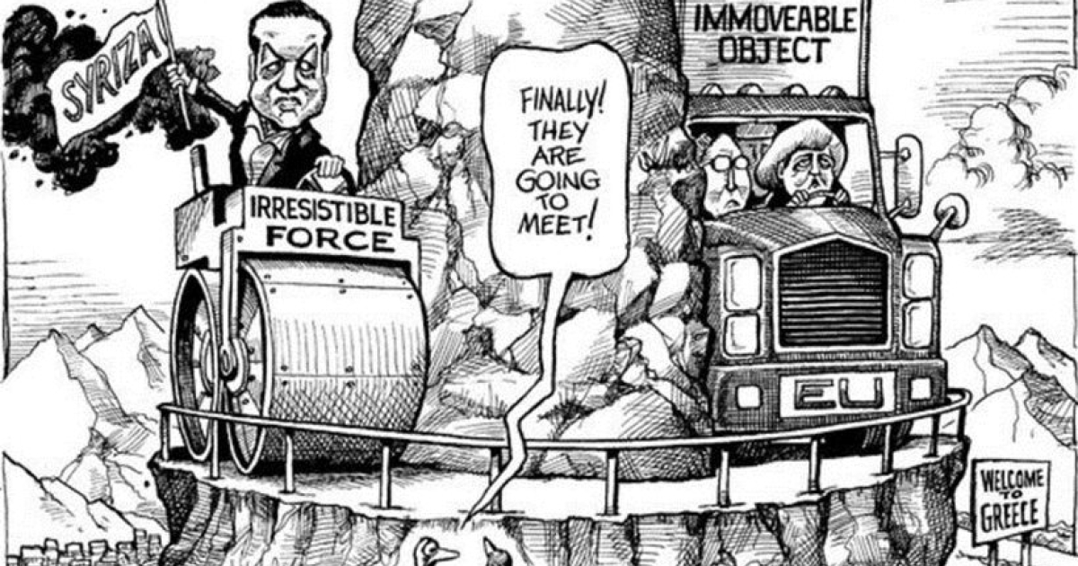 Από τη μία πλευρά καταφτάνει ο Ελληνας πρωθυπουργός επάνω σε έναν οδοστρωτήρα, με δυναμικό-μαχητικό ύφος, κρατώντας τη σημαία του ΣΥΡΙΖΑ και από την άλλη η γερμανίδα καγκελάριος Ανγκελα Μέρκελ οδηγεί μια νταλίκα. Πριν συναντηθούν, τους χωρίζει... μια λεζάντα που γράφει: «Επιτέλους θα συναντηθούν».